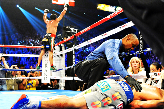 En el sexto asalto, el filipino se fue volcado al frente sabiendo que tenía todo para ganar. Cuando de repente, la mano derecha de Juan se iluminó. En valiente contragolpe el mexicano soltó un gancho demoledor que mandó a la lona a Pacquiao. Lo impensable acababa de pasar. Nocaut al “Pacman”. Temblaba en Nevada y el filipino yacía rendido sobre el cuadrilátero sin poderse levantar. La noticia daba la vuelta al mundo y se escribía historia en el mundo del box.