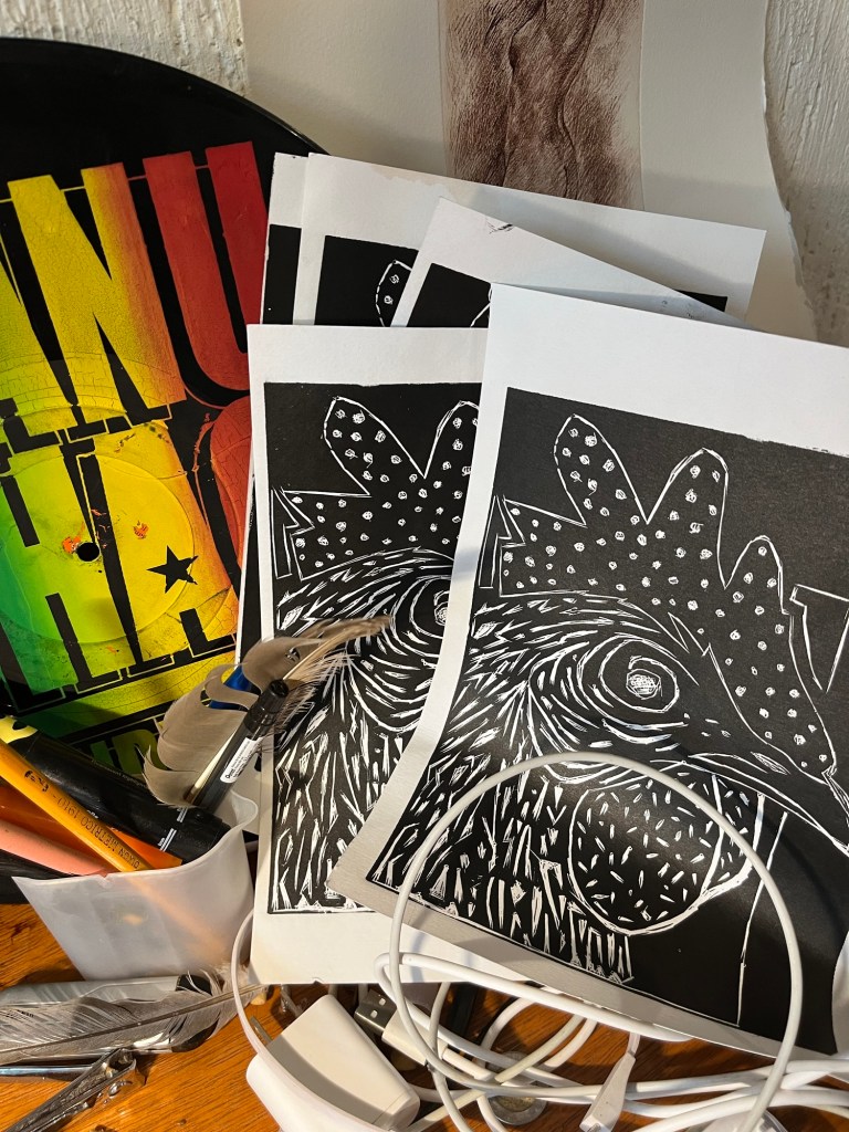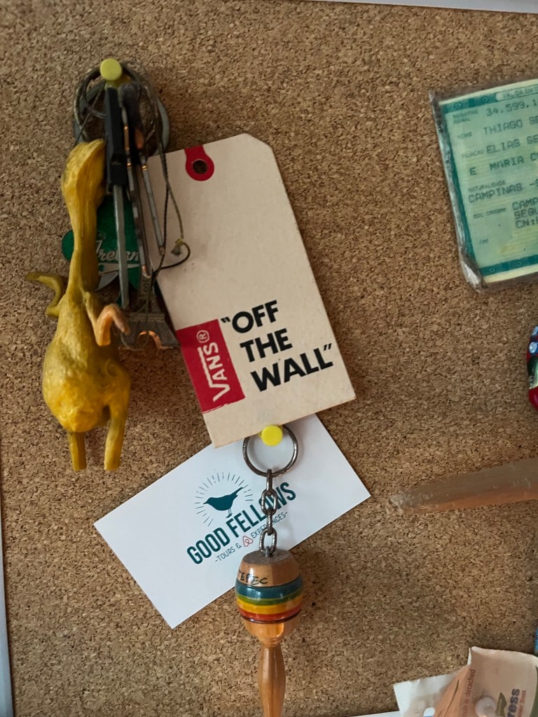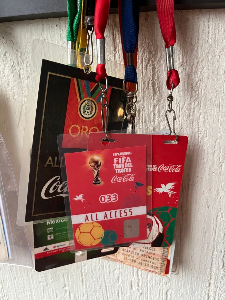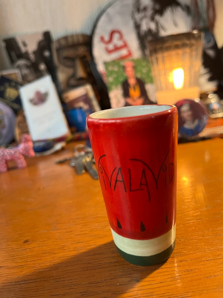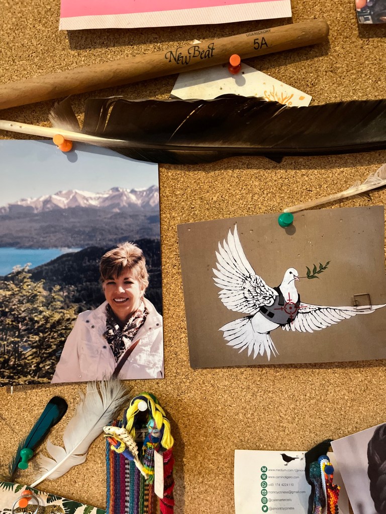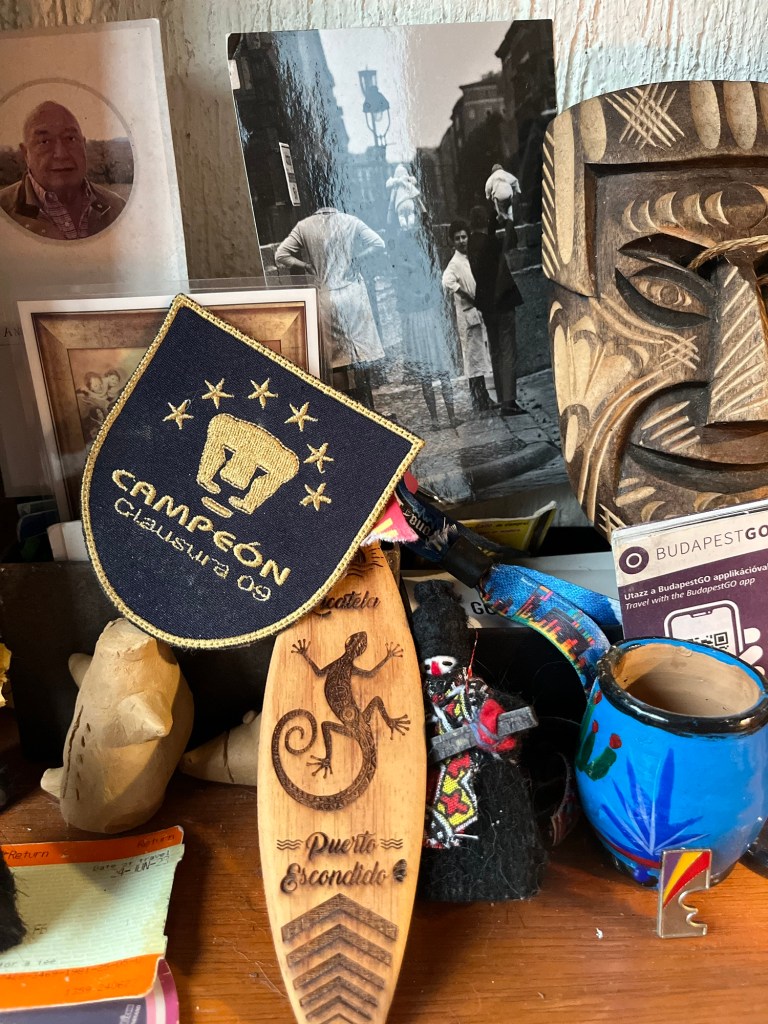 En este altar hay plumas, proyectos, textiles, libretas, velas, postales, fotos, las llaves de los sitios donde he vivido, estampas, gorras, pulseras y artesanos. Le faltan flores de «cempasúchitl», pero estaba muy caro el manojo y luego se me marchitan.